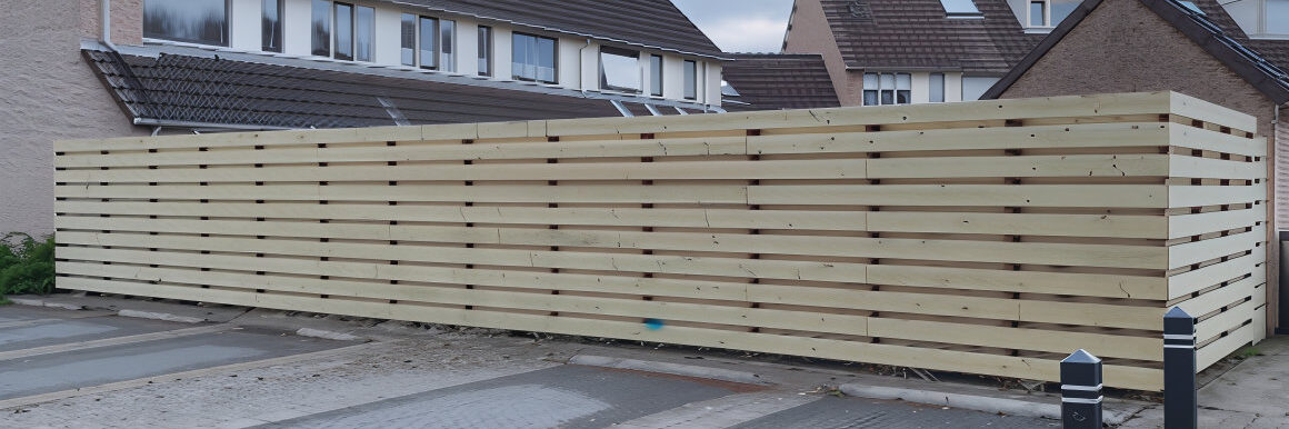Mooie grote schutting van geimpregneerd grenen gemonteerd op hardhouten palen. Een stevige poort maakt het af. Gegarandeerd 20 jaar solide en onderhoudsvrij.